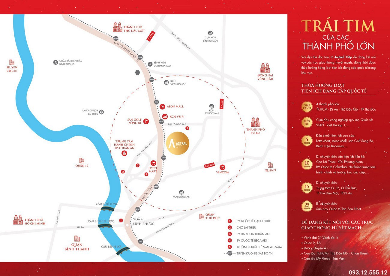 Dự án Astral City Bình Dương có vị trí vô cùng thuận tiện. Từ đây có thể di chuyển dễ dàng đến các khu vực lân cận như: